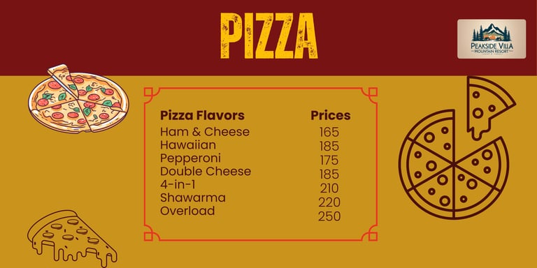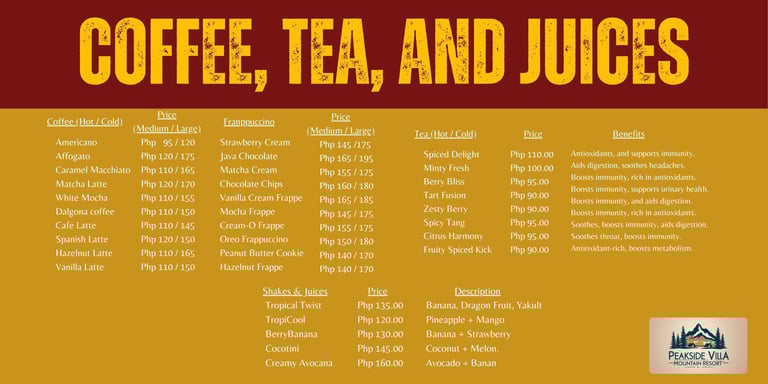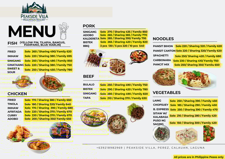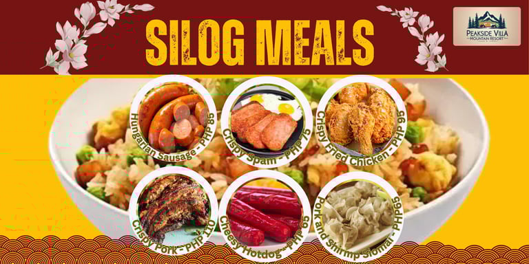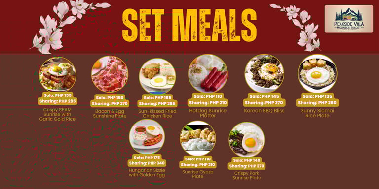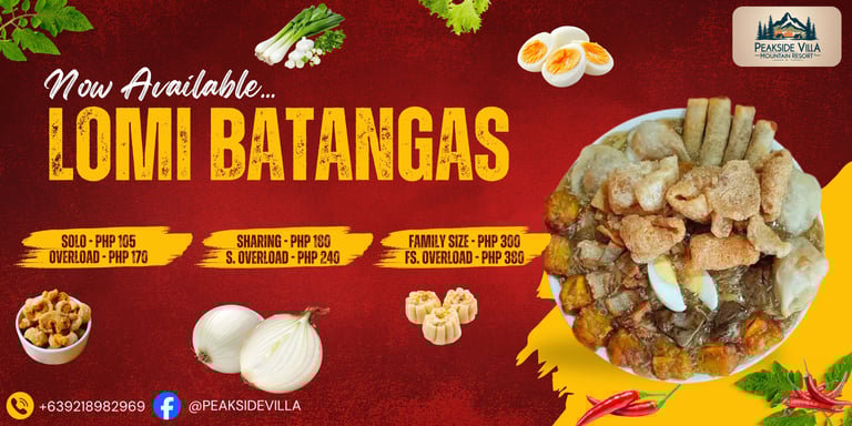 Dining at Peakside Villa is more than just a meal—it’s a celebration of Filipino culinary heritage and a retreat into nature. Our menu highlights authentic flavors, from the iconic Loming Batangas to hearty rice meals, local snacks, and signature coffee blends. Guests can also enjoy familiar comfort food options, making every dining experience both nostalgic and refreshing. Whether starting your day with rich coffee, sharing rice meals with family, or indulging in local delicacies, Peakside Villa offers a serene culinary escape that connects food, culture, and community in Calauan, Laguna.